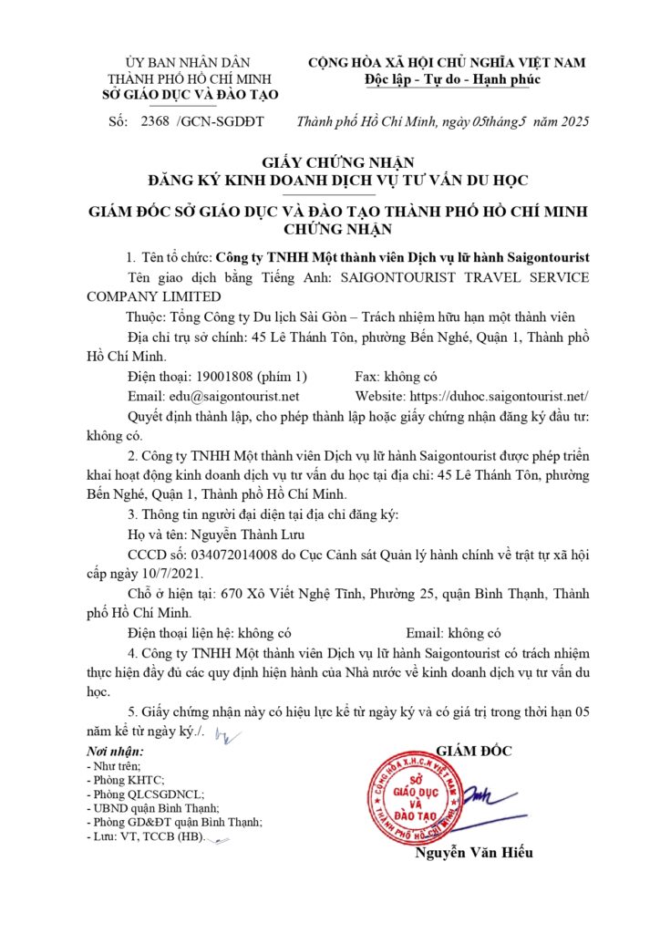 Giấy đăng ký kinh doanh dịch vụ tư vấn du học 2368/GCN-SGDĐT ngày 05/05/2025
